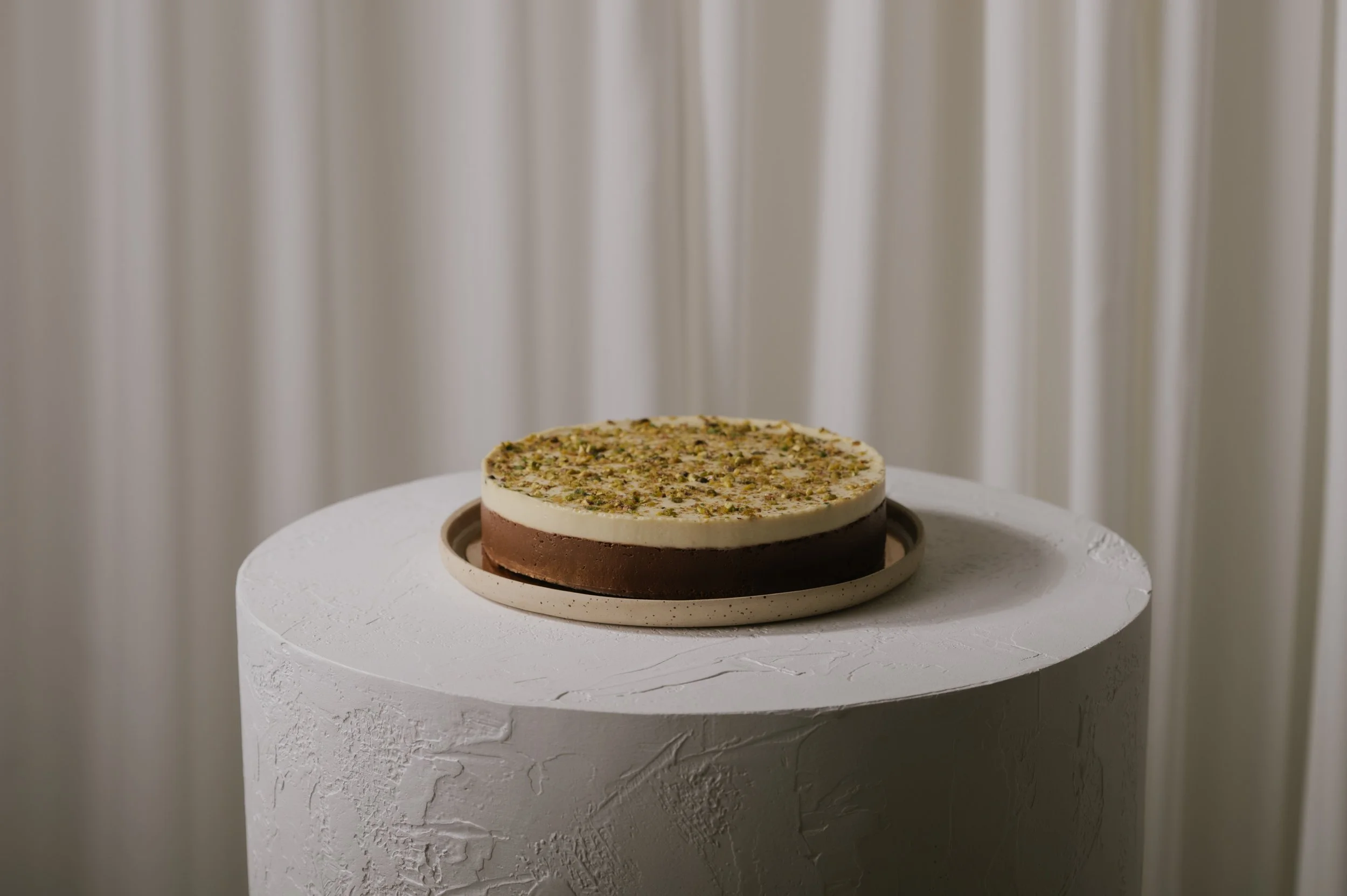 Kakaós piskóta, csoki mousse, pisztácia ropogós, vegán fehércsoki mousse és pisztácia szórás.