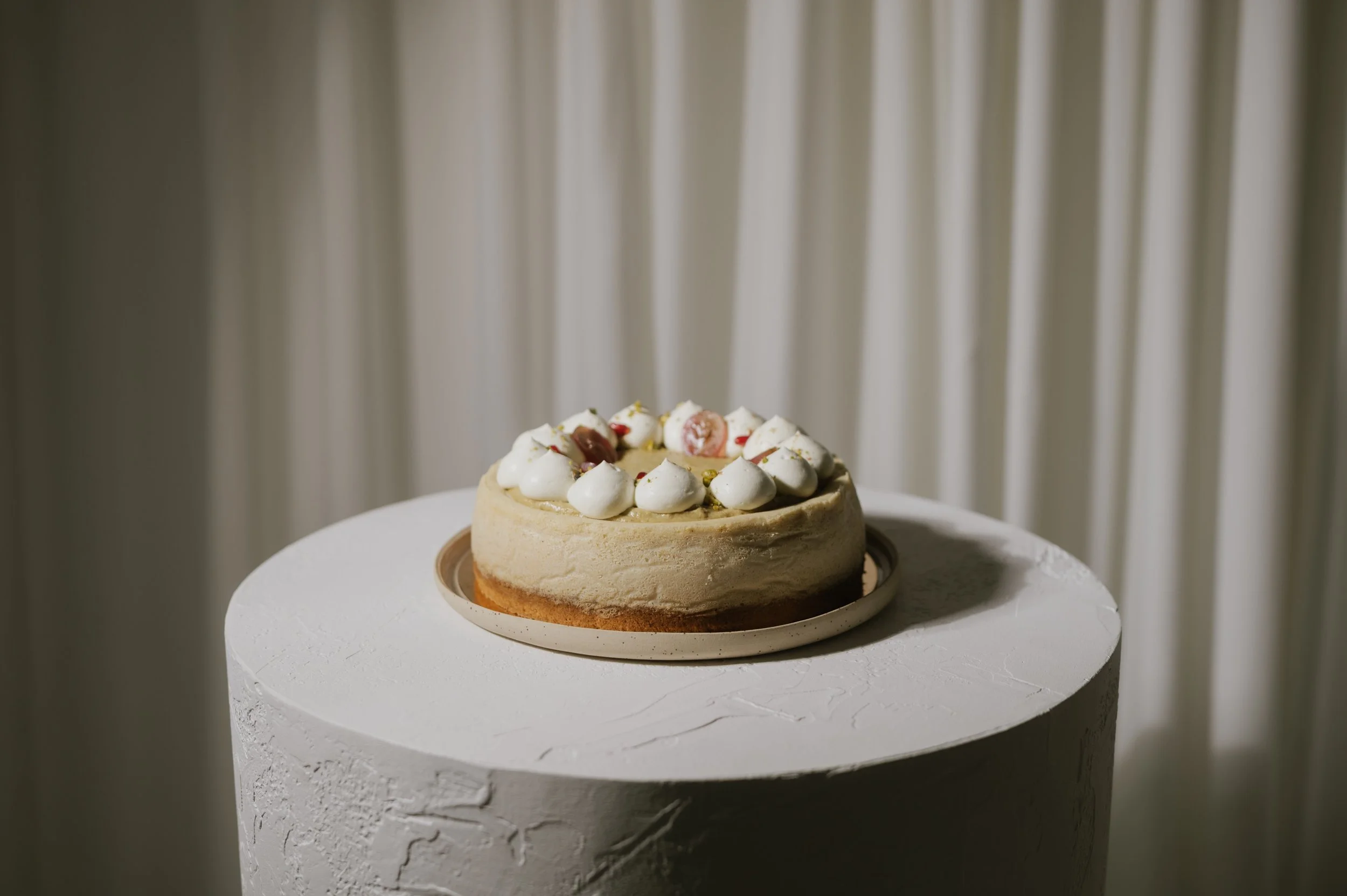 Mandulás linzer alap, könnyed, citrusos “sajttorta, pisztácia krémmel vagy frissítő gyümölcs zselével a tetején.